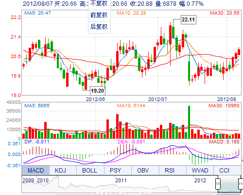 今 开: 20.66 成交量: 6878手 振 幅: 1.50% 最 高: 20.97 成交额: 1432.63万 换手率: 0.57% 最 低: 20.66 总市值: 89.20亿 市净率: 6.29 昨 收: 20.72 流通市...