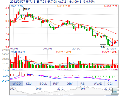 今 开: 7.18 成交量: 10948手 振 幅: 1.82% 最 高: 7.21 成交额: 784.03万 换手率: 0.56% 最 低: 7.08 总市值: 14.37亿 市净率: 2.98 昨 收: 7.16 流通市值:...