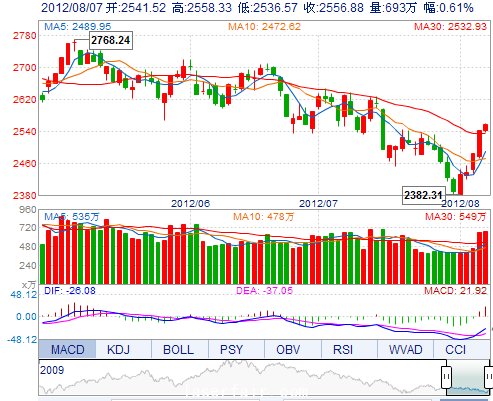 今 开: 2541.52 最 高: 2558.33 最 低: 2536.57 振 幅: 0.86% 昨 收: 2541.31 成交量: 6926820手 成交额: 855404.10万 换手率: --