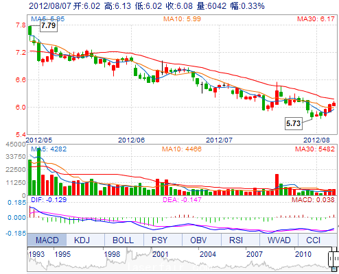 今 开: 6.02 成交量: 6041手 振 幅: 1.82% 最 高: 6.13 成交额: 366.85万 换手率: 0.35% 最 低: 6.02 总市值: 10.56亿 市净率: 2.61 昨 收: 6.06 流通市值: ...