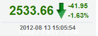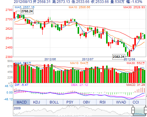 今 开: 2568.31 最 高: 2573.13 最 低: 2533.66 振 幅: 1.53% 昨 收: 2575.61 成交量: 5298768手 成交额: 632164.42万 换手率: --
