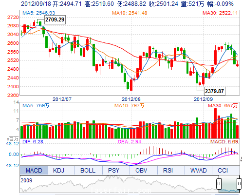 今 开: 2494.71 最 高: 2519.60 最 低: 2488.82 振 幅: 1.23% 昨 收: 2503.41 成交量: 5208603手 成交额: 570237.96万 换手率: --
