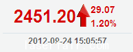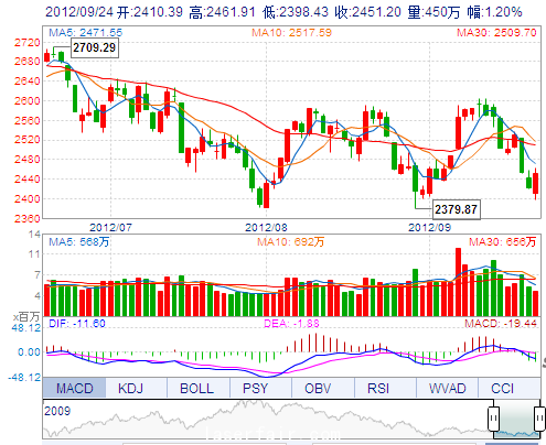 今 开: 2410.39 最 高: 2461.91 最 低: 2398.43 振 幅: 2.62% 昨 收: 2422.13 成交量: 4500150手 成交额: 486695.76万 换手率: --
