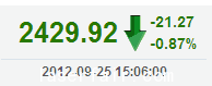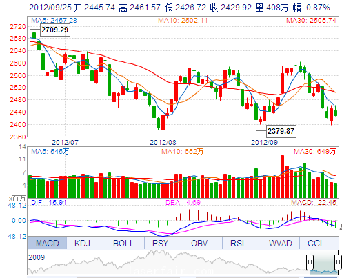 今 开: 2445.74 最 高: 2461.57 最 低: 2426.72 振 幅: 1.42% 昨 收: 2451.20 成交量: 4080026手 成交额: 400283.80万 换手率: --