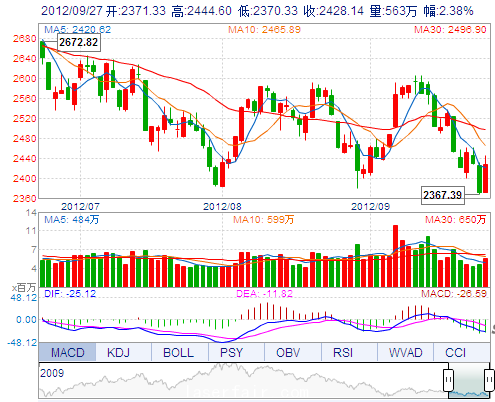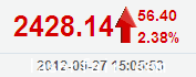 今 开: 2371.33 最 高: 2444.60 最 低: 2370.33 振 幅: 3.13% 昨 收: 2371.74 成交量: 5632544手 成交额: 551633.37万 换手率: --