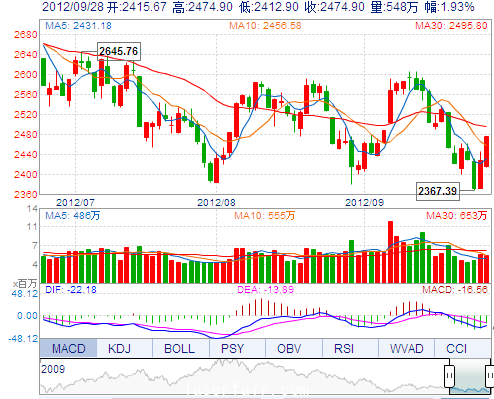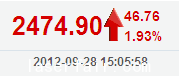 今 开: 2415.67 最 高: 2474.90 最 低: 2412.90 振 幅: 2.55% 昨 收: 2428.14 成交量: 5483343手 成交额: 590821.89万 换手率: --