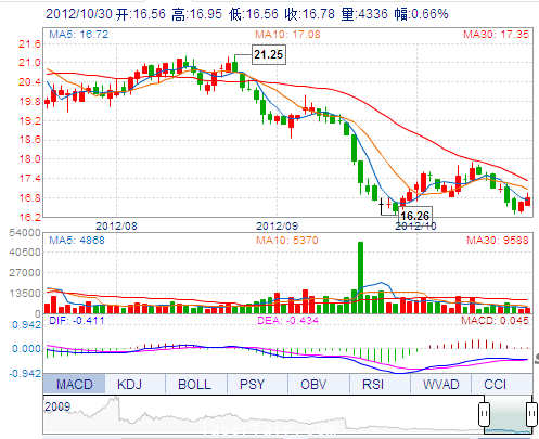 今 开: 16.56 成交量: 4335手 振 幅: 2.34% 最 高: 16.95 成交额: 730.31万 换手率: 0.34% 最 低: 16.56 总市值: 71.68亿 市净率: 4.91 昨 收: 16.67 流通市...