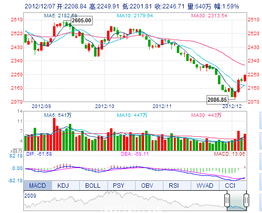 今 开: 2208.84 最 高: 2249.91 昨 收: 2211.64 最 低: 2201.81 成交量: 640.11万手 振 幅: 2.17% 成交额: 53.09亿元