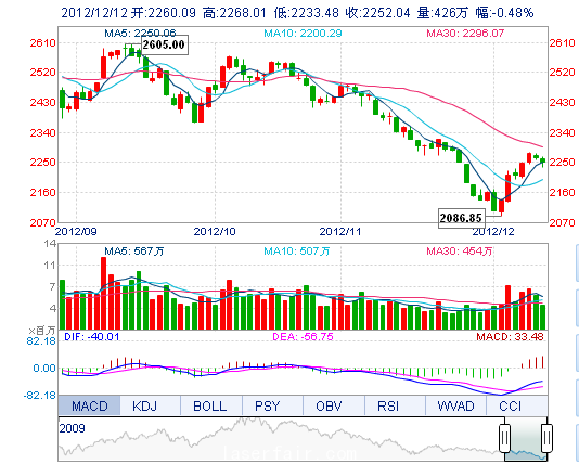 今开: 2260.09 最高: 2268.01 昨收: 2262.99 最低: 2233.48 成交量: 426.21万手 振幅: 1.53% 成交额: 39.04亿元