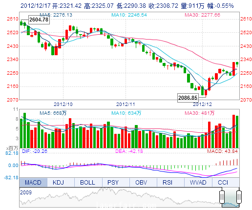 今 开: 2321.42 最 高: 2325.07 昨 收: 2321.51 最 低: 2290.38 成交量: 910.94万手 振 幅: 1.49% 成交额: 92.74亿元