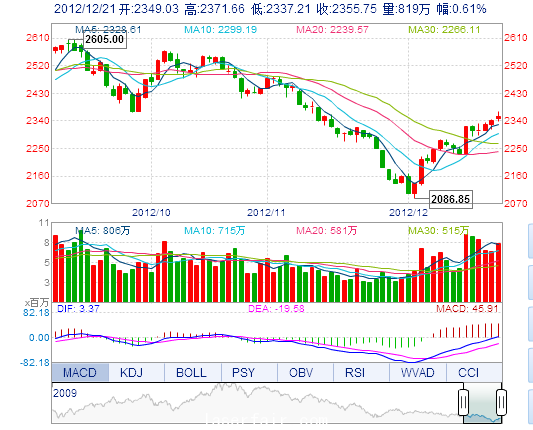 今 开: 2349.04 最 高: 2371.66 昨 收: 2341.57 最 低: 2337.21 成交量: 818.78万手 振 幅: 1.47% 成交额: 85.05亿元