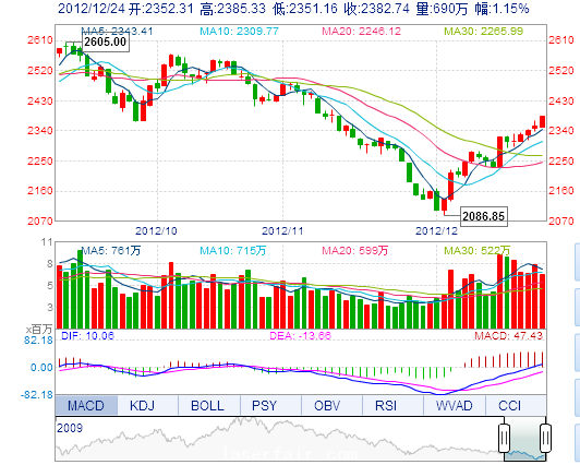 今 开: 2352.31 最 高: 2385.33 昨 收: 2355.75 最 低: 2351.16 成交量: 690.22万手 振 幅: 1.45% 成交额: 75.66亿元