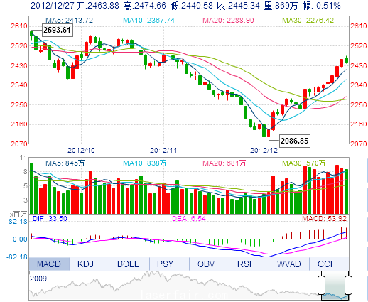 今 开: 2463.88 最 高: 2474.66 昨 收: 2458.00 最 低: 2440.58 成交量: 868.59万手 振 幅: 1.39% 成交额: 96.40亿元