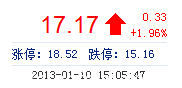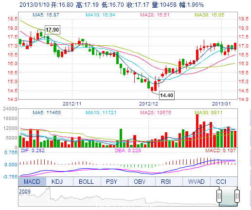 今 开: 16.80 成交量: 1.05万手 振 幅: 2.91% 最 高: 17.19 成交额: 1769.13万元 换手率: 0.31% 最 低: 16.70 总市值: 73.35亿 市净率: 5.02 昨 收: 16.84 流...