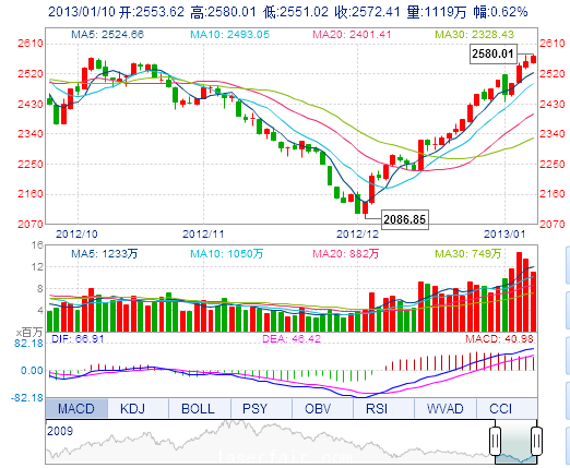 今 开: 2553.62 最 高: 2580.01 昨 收: 2556.64 最 低: 2551.02 成交量: 1119.22万手 振 幅: 1.13% 成交额: 109.61亿元