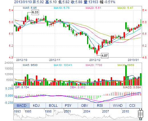 | 最 高: | 6.10 | 成交额: | 785.35万元 | 换手率: | 0.76% |