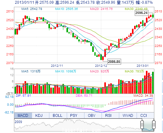 今 开: 2575.09 最 高: 2596.24 昨 收: 2572.41 最 低: 2543.78 成交量: 1436.51万手 振 幅: 2.04% 成交额: 133.45亿元