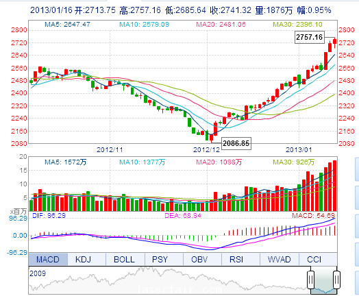 今 开: 2713.75 最 高: 2757.16 昨 收: 2715.51 最 低: 2685.64 成交量: 1876.44万手 振 幅: 2.63% 成交额: 174.48亿元