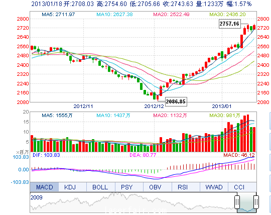 今开: 2708.03 最高: 2754.60 昨收: 2701.21 最低: 2705.66 成交量: 1232.94万手 振幅: 1.81% 成交额: 120.63亿元