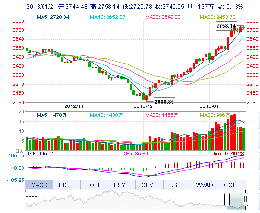 今开: 2744.48 最高: 2758.14 昨收: 2743.63 最低: 2725.78 成交量: 1196.86万手 振幅: 1.18% 成交额: 128.32亿元