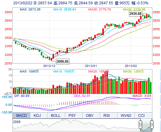 今开: 2857.64 最高: 2884.75 昨收: 2862.75 最低: 2844.59 成交量: 964.95万手 振幅: 1.40% 成交额: 115.11亿元