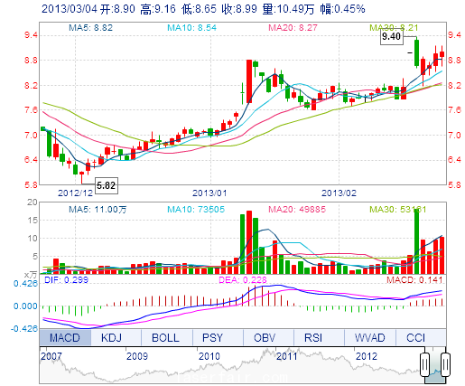 | 今 开: | 8.90 | 成交量: | 10.49万手 | 振 幅: | 5.70% |