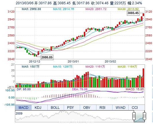 今开: 3017.86 最高: 3085.45 昨收: 3004.11 最低: 3017.86 成交量: 2235.39万手 振幅: 2.25% 成交额: 203.04亿元