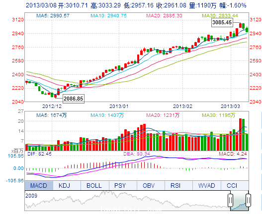 今 开: 3010.71 最 高: 3033.29 昨 收: 3009.21 最 低: 2957.16 成交量: 1190.06万手 振 幅: 2.53% 成交额: 126.27亿元