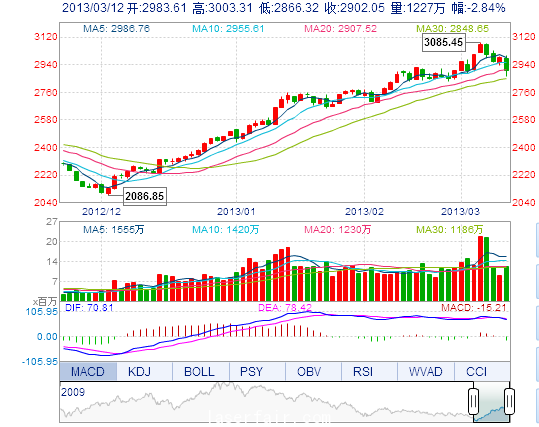 今 开: 2983.61 最 高: 3003.31 昨 收: 2986.99 最 低: 2866.32 成交量: 1227.47万手 振 幅: 4.59% 成交额: 131.67亿元
