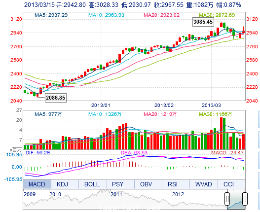 今 开: 2942.81 最 高: 3028.33 昨 收: 2941.97 最 低: 2930.97 成交量: 1081.72万手 振 幅: 3.31% 成交额: 134.84亿元