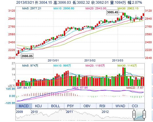 今 开: 3004.15 最 高: 3066.04 昨 收: 3000.00 最 低: 3002.32 成交量: 1093.71万手 振 幅: 2.12% 成交额: 129.05亿元