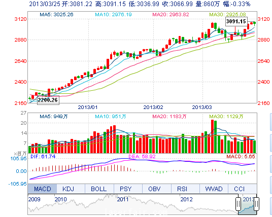 今开: 3081.23 最高: 3091.15 昨收: 3077.01 最低: 3036.99 成交量: 859.94万手 振幅: 1.76% 成交额: 110.02亿元