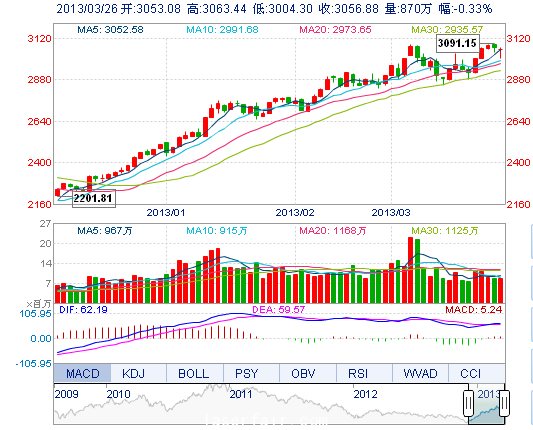 今开: 3053.08 最高: 3063.44 昨收: 3066.99 最低: 3004.30 成交量: 869.99万手 振幅: 1.93% 成交额: 107.44亿元