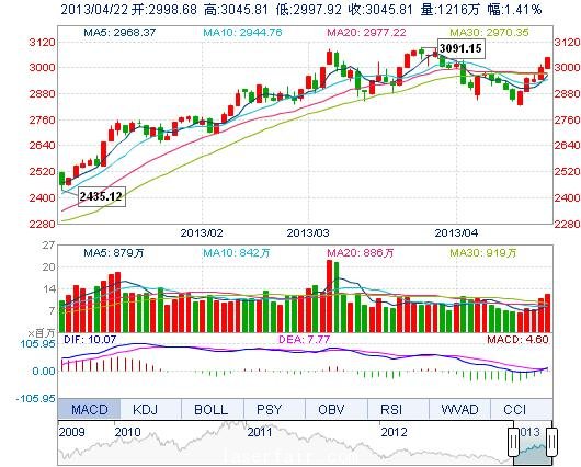 今开: 2998.68 最高: 3045.81 昨收: 3003.56 最低: 2997.92 成交量: 1216.21万手 振幅: 1.59% 成交额: 139.08亿元