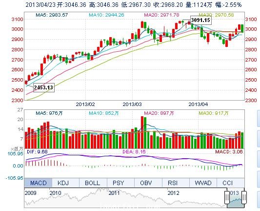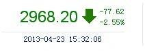 今开: 3046.36 最高: 3046.36 昨收: 3045.81 最低: 2967.30 成交量: 1123.88万手 振幅: 2.60% 成交额: 138.62亿元