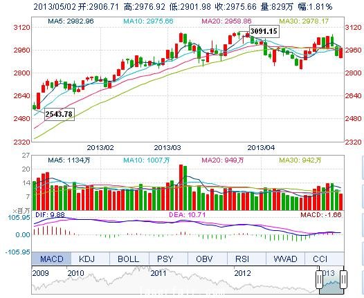 今开: 2906.71 最高: 2976.92 昨收: 2922.87 最低: 2901.98 成交量: 828.98万手 振幅: 2.56% 成交额: 105.74亿元