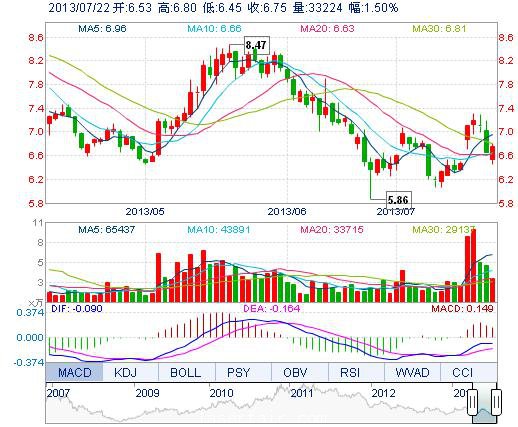| 最 高: | 6.80 | 成交额: | 2204.21万元 | 换手率: | 1.71% |