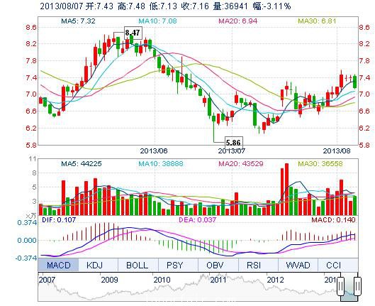 今开: 7.43 成交量: 3.69万手 振幅: 4.74% 最高: 7.48 成交额: 2678.92万元 换手率: 1.90% 最低: 7.13 总市值: 14.27亿 市净率: 2.95 昨收: 7.39 流通市值: ...