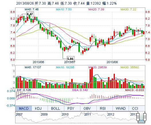 今开: 7.30 成交量: 1.24万手 振幅: 2.18% 最高: 7.46 成交额: 918.36万元 换手率: 0.64% 最低: 7.30 总市值: 14.82亿 市净率: 3.06 昨收: 7.35 流通市值: 1...