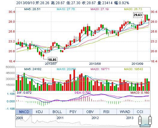 今开: 28.26 成交量: 2.34万手 振幅: 4.82% 最高: 28.67 成交额: 6535.36万元 换手率: 0.69% 最低: 27.30 总市值: 124.04亿 市净率: 8.06 昨收: 28.41 流通市...