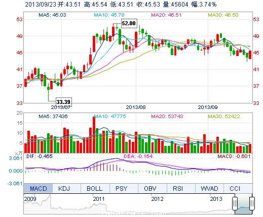 今开: 43.51 成交量: 4.56万手 振幅: 4.63% 最高: 45.54 成交额: 2.04亿元 换手率: 1.59% 最低: 43.51 总市值: 135.52亿 市净率: 9.08 昨收: 43.89 流通市值...