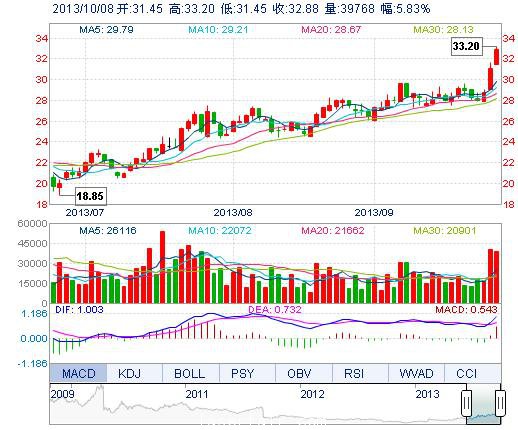 今开: 31.45 成交量: 3.98万手 振幅: 5.63% 最高: 33.20 成交额: 1.29亿元 换手率: 1.17% 最低: 31.45 总市值: 142.25亿 市净率: 9.25 昨收: 31.07 流通市值...