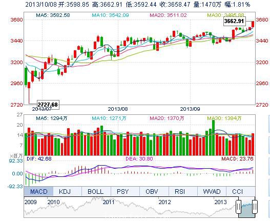 今开: 3598.85 最高: 3662.92 昨收: 3593.54 最低: 3592.44 成交量: 1470.02万手 振幅: 1.96% 成交额: 208.81亿元