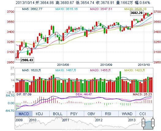 今开: 3664.86 最高: 3680.67 昨收: 3655.54 最低: 3654.74 成交量: 1661.54万手 振幅: 0.71% 成交额: 221.39亿元