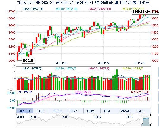 今开: 3685.31 最高: 3699.71 昨收: 3678.91 最低: 3635.71 成交量: 1660.61万手 振幅: 1.74% 成交额: 222.61亿元