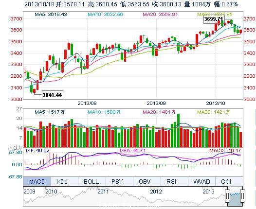 今开: 3578.11 最高: 3600.45 昨收: 3576.35 最低: 3563.55 成交量: 1084.07万手 振幅: 1.03% 成交额: 158.95亿元