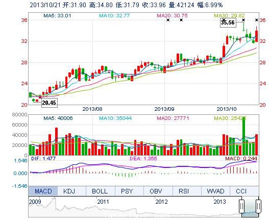 今开: 31.90 成交量: 4.21万手 振幅: 9.48% 最高: 34.80 成交额: 1.42亿元 换手率: 1.24% 最低: 31.79 总市值: 146.93亿 市净率: 9.55 昨收: 31.74 流通市值...