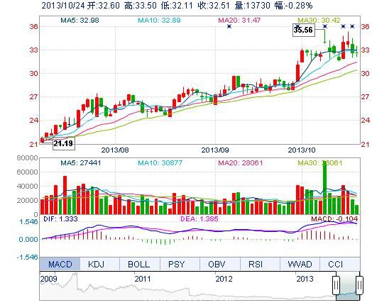 今开: 32.60 成交量: 1.37万手 振幅: 4.26% 最高: 33.50 成交额: 4527.31万元 换手率: 0.40% 最低: 32.11 总市值: 140.65亿 市净率: 9.14 昨收: 32.60 流通市...