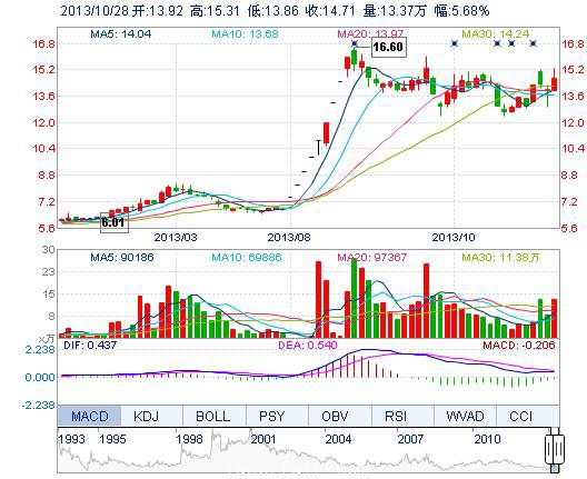 今开: 13.92 成交量: 13.37万手 振幅: 10.42% 最高: 15.31 成交额: 1.99亿元 换手率: 7.70% 最低: 13.86 总市值: 25.55亿 市净率: 7.30 昨收: 13.92 流通市值...