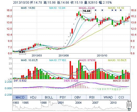 今开: 14.78 成交量: 9.26万手 振幅: 8.88% 最高: 15.98 成交额: 1.43亿元 换手率: 5.33% 最低: 14.66 总市值: 26.38亿 市净率: 7.54 昨收: 14.87 流通市值:...